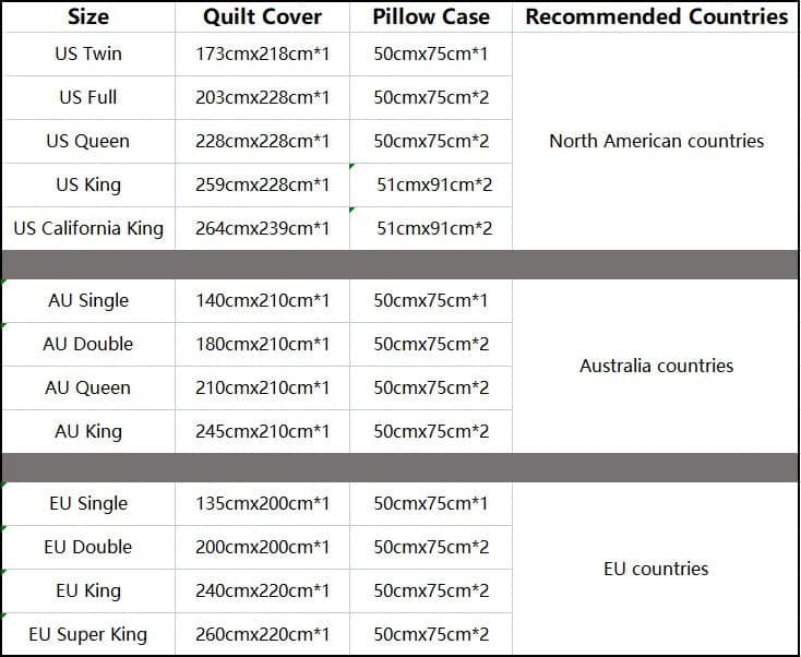 AU KING: 245cm x 210cm  + 2 pillow casesEU SINGLE: 135cm x 200cm + 1 pillow case
